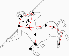 "The Greek name was Cheiron, which means the pierced, or who pierces. In the Greek fables Cheiron was renowned for his skill in hunting, medicine, music, athletics, and prophecy. All the most distinguished heroes of Greece are described as his pupils. He was supposed to be immortal, but he voluntarily agreed to die; and, wounded by a poisoned arrow (not intended for him) while in conflict with a wild boar, he transferred his immortality to Prometheus; whereupon he was placed amongst the stars.