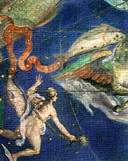 “In Greek mythology, Pisces is associated with the great beast Typhon. This fearsome creature belonged to the earlier age of the Titans, and was a terrifying force even for the greatest of the gods. At one time Typhon attacked Mount Olympus, abode of the gods. To escape from his wrath, each deity took the form of an animal. Zeus himself, shifted into the likeness of a ram. Aphrodite, and her son Eros, escaped the beast by transforming into a pair of fish and swimming away into the Euphrates river. The goddess Minerva placed the image of the fishes in the heavens so that the event would not be forgotten.” (Earthlore) |