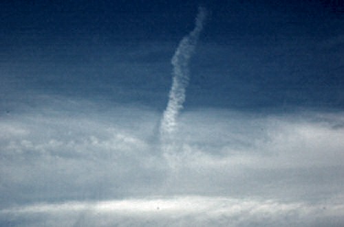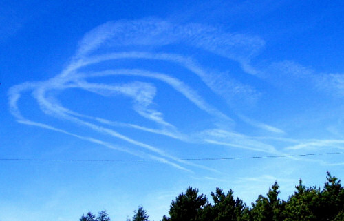 Mid-Oregon Coast summer 2005. Chemtrails like this are not always weather related. Sightings of glowing orbs are occasionally reported with this kind of activity. A.K. Johnstone, Ph.D. has written a book titled UFO Defense Tactics in which she puts forth a theory that the chemtrails create some kind of a electrical barrier that when penetrated by a UFO creates break in the current that allows for an alert signal to be generated that goes to NORAD generating some kind of defense response by Space Command. Look for orbs in these situations. Take numerous pictures then examine them for craft working at the edge of this dimension. The US/NSA has had its own fleet of UFO's for quite some time now and these can be seen interacting with the orbs that are pointed out by the circular chemtrails.