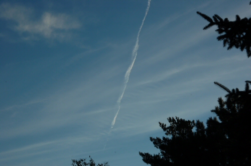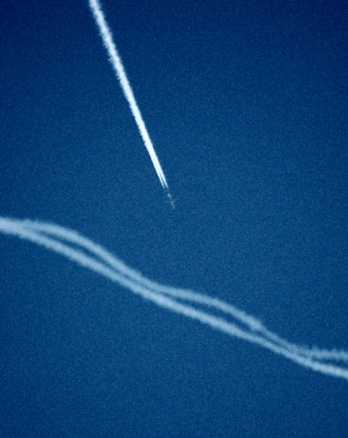 A November morning here in Idaho and looking south... A fat trail rising from below disperses toward the east then ends... The next trail above marked the uppermost (northern) extent of the conditions that allowed for the first trail to persist. A different mixture is being laid down by a MD90 a little farther up the image. Generate the high clouds to make the invisible scalar waves visible.