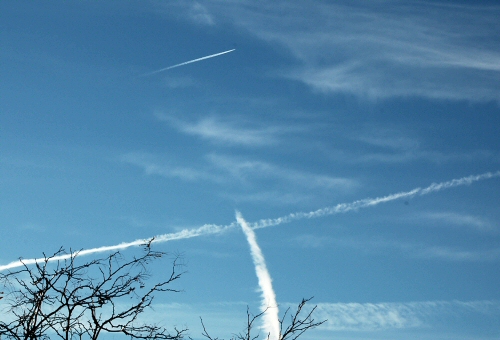 Marking the sky with a grid of chemtrails looking for atmospheric manipulation by EM-electromagnetic tools. Note the nice uplift and tear in the middle chemtrail. This spot was isolated by further north-south marking chemtrail flights.