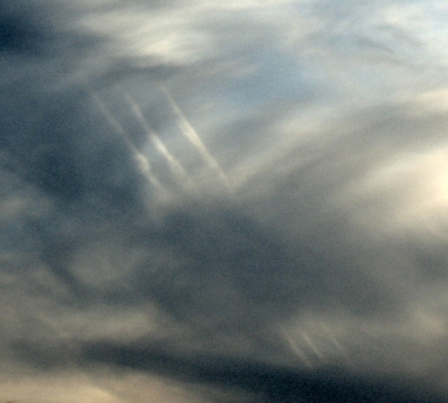 A triplet of chemtrails partially obscured by a lower layer of thin clouds. Indiana.